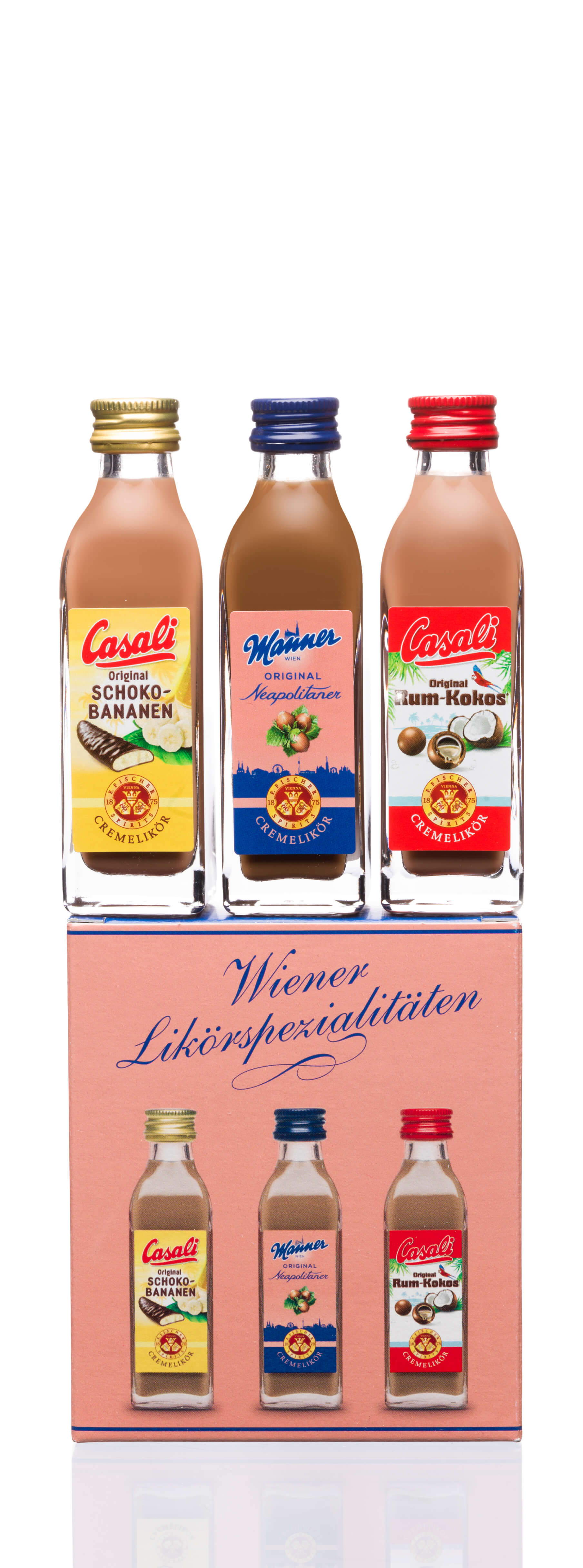A well-balanced cream liqueur composition with the typically hearty chocolate-hazelnut taste of traditional Viennese “Manner” wafers. This fantastically balanced duet of rum and coconut gives rise to an unmistakable summer feeling! A sensuous and exquisite composition with the taste of finest chocolate and banana. You’ll want to sink your teeth right into it!